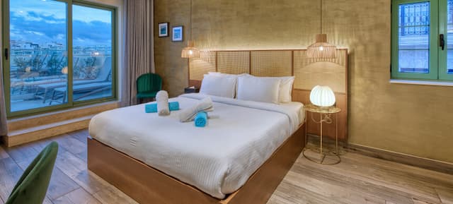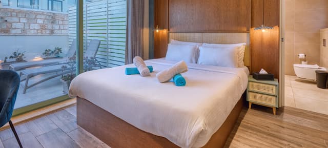 The zest of the Mediterranean in a Deluxe Double Room, at your fingertips! Soak up the sun and create lasting memories with friends and family, with a spacious terrace and communal 5m x 3m communal pool on your doorstep!