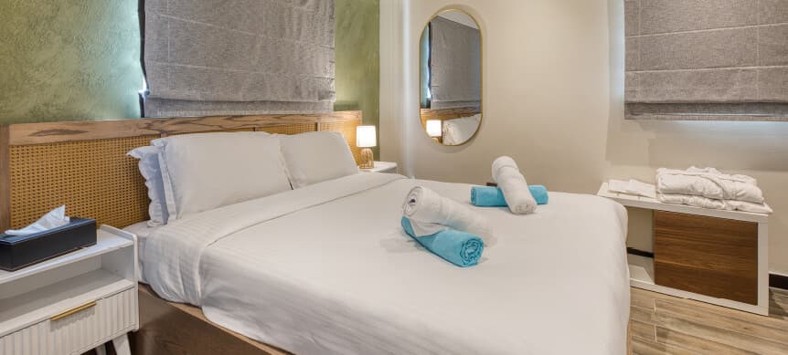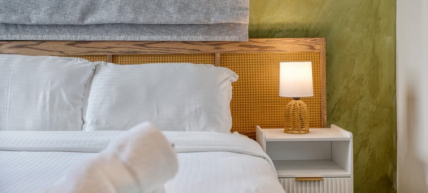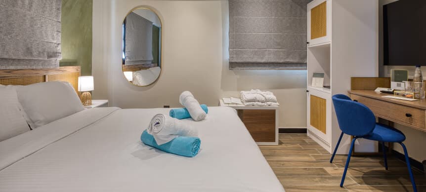 Inspired by a palette of soft neutrals and gentle earthy tones, this inviting ambience extends into our Superior Double Room, perfectly positioned above the village centre. Contemporary lines and refined finishes are thoughtfully paired with timeless textures, creating a space that feels both modern and warmly authentic.