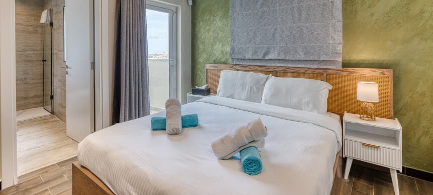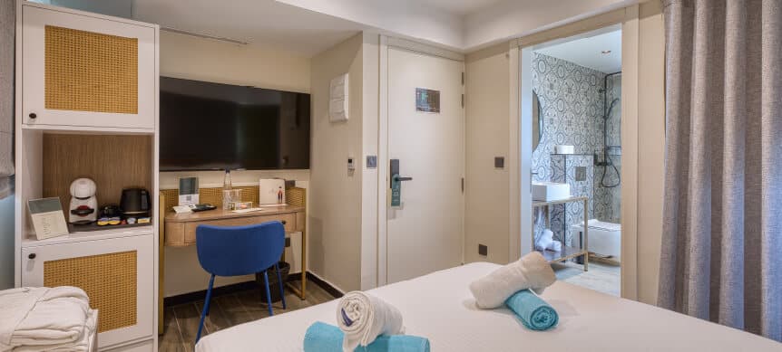 Inspired by a palette of soft neutrals and gentle earthy tones, this inviting ambience extends into our Superior Double Room, perfectly positioned above the village centre. Contemporary lines and refined finishes are thoughtfully paired with timeless textures, creating a space that feels both modern and warmly authentic.